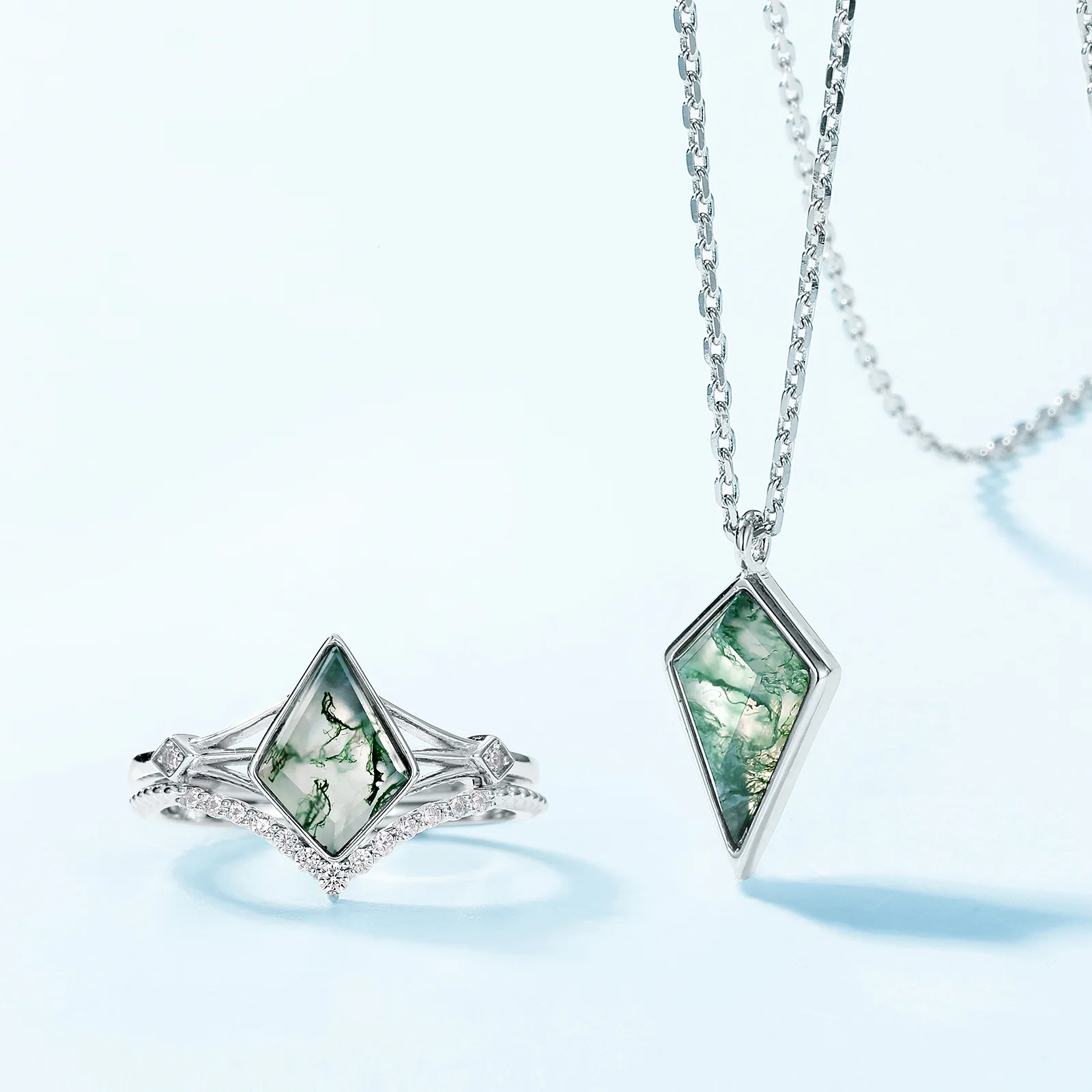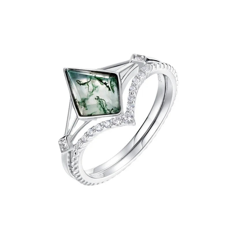 Kite Cut Natural Gem Unique Moss Agate 7*10mm 925 Silver Promise Ring Set